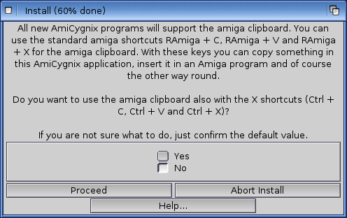 The next question is for Windows users - it asks if you want to use Windows Cut, Copy and Paste shortcut keys instead of Amiga shortcut keys for the same functions. I left it as No and pressed Proceed, but this is really personal preference!
